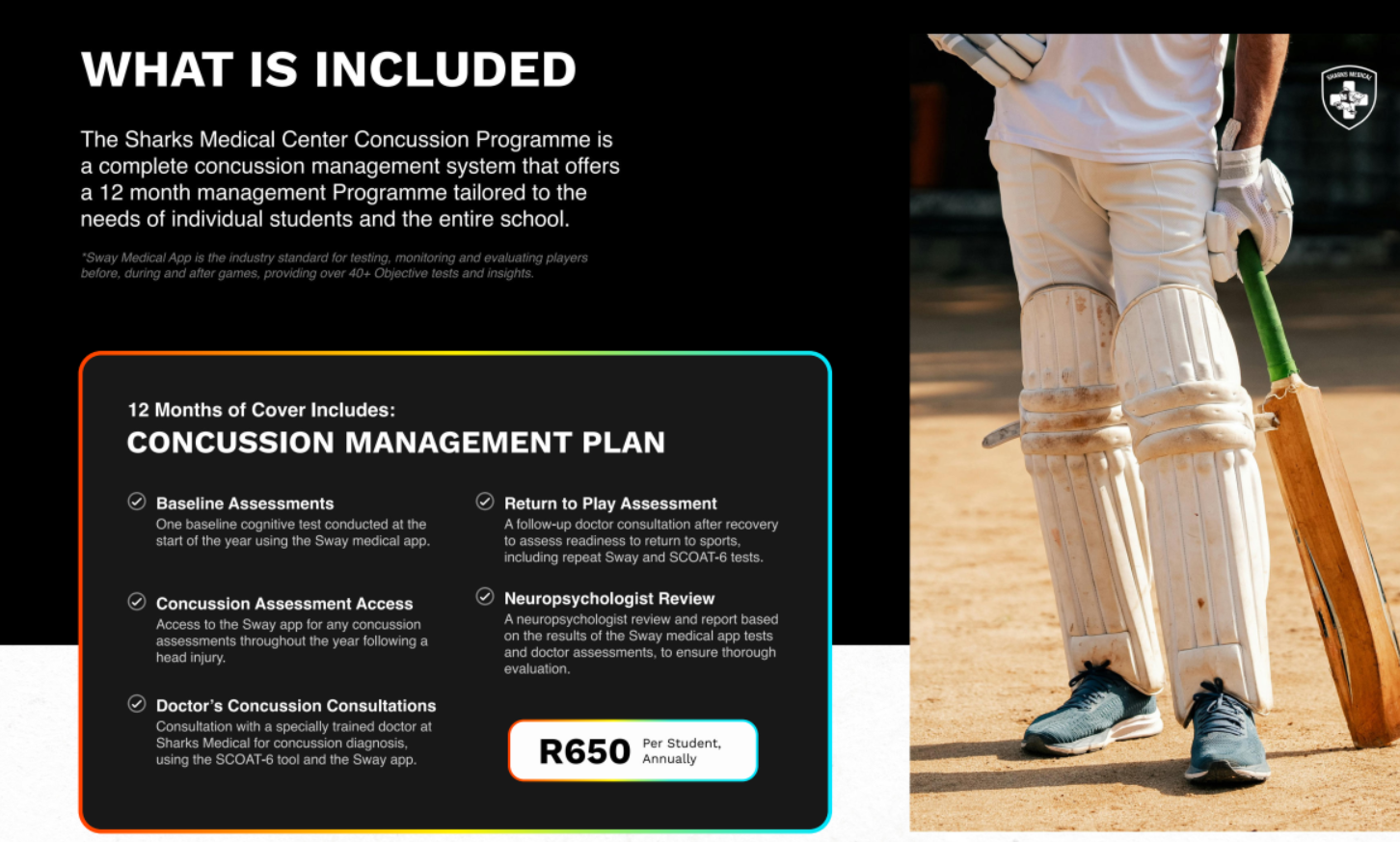 Concussion Programme Further Information Apply Contact Us Tel: 031 312 7506 | WhatsApp: +27 78 746 8661Email: reception@sharksmedical.co.za